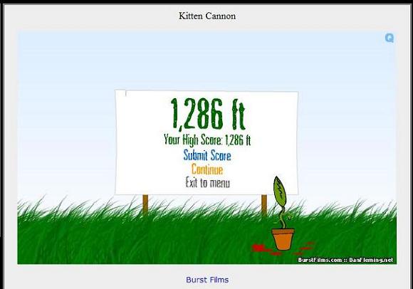 Gold Member Username: Thx_3417Bournemouth ... Post Number: 4498 Registered: May-05 | Kitten Cannon http://www.ulink.net/crossroads/fun/cannon.html Here's a fun little game and I hope I haven't offended any cat owners I like cats myself, so play away see how far you can fire the cat! Here's how far I've got the poor little kitten. ![]() |
